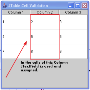 I think, to assign a JTextField in JTable cells is really important for the purpose of JTable cell validation. For many purpose in software development where we use JTable may need to use JTable cell validation  and for this validation purpose we may also need to assign and use JTextField in JTable cell. In the given Example, I have assigned and used  a JTextField  in the  Column 2  of the following JTable. Just Copy the code and Run it in your computer.