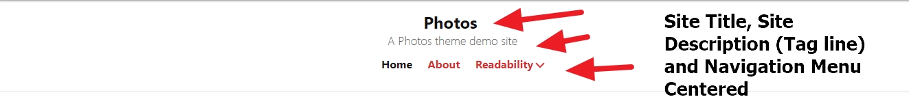 photos theme by automattic Site title Tag line and Menu to show centred