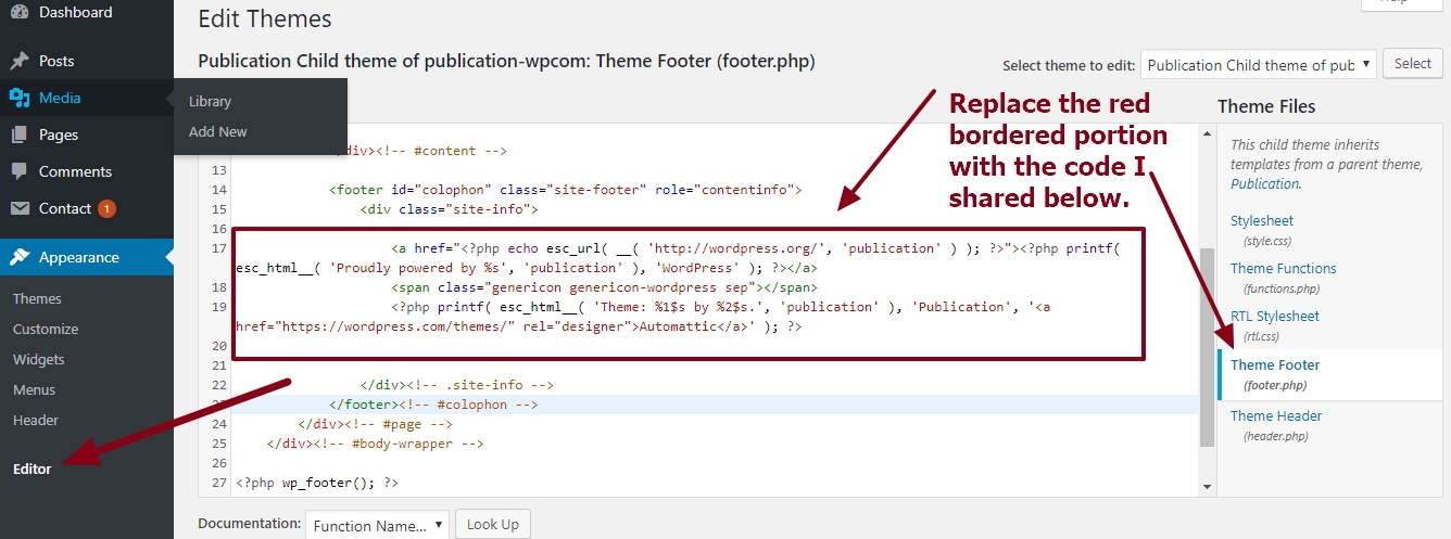 theme publication by automattic footer copyright info and year modification