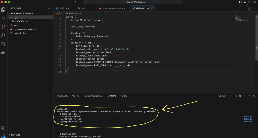 Create a folder named nginx in the same dockerwordpress folder, and inside that nginx folder create a file named default.conf and paste this script