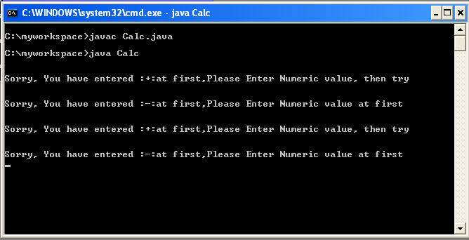 System.out.println(“Sorry, You have entered :”+ch+”:at first,Please Enter Numeric value, then try”);